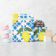 This wrapping paper features a watercolor French country tile and lemon pattern in blue and yellow.