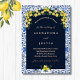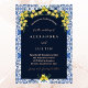 Personalise this Italian Wedding Invitation and capture the romance of a Mediterranean summer with this elegant and vibrant design. A stunning arch of yellow Amalfi Coast lemons intertwined with lush greenery creates a refreshing and timeless aesthetic, set against a classical blue and white Italian tile border. The sophisticated modern and script font in rose gold foil adds a touch of luxury against a chic navy blue background, making this the perfect choice for a summer destination wedding. Inspired by the beauty of citrus fruit and the charm of the Italian coast, this invitation sets the tone for an unforgettable celebration filled with love and la dolce vita!