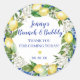 Designed to coordinate with the Jenny's Lemon Collection, this bridal brunch and bubbly sticker features a yellow lemon and white floral wreath. There is a hint of the blue tiles around the edge of the round sticker. The bride's name and bridal luncheon is written in a modern and trendy script font. The date completes the text. A small yellow heart adds a touch of romance. All the text is editable.