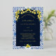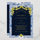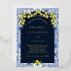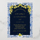 Personalise this Mediterranean Italian Wedding Invitation – Perfect for a summer destination wedding, this elegant invitation captures the romance of Italy with a vibrant arch of yellow Amalfi Coast lemons intertwined with lush greenery, set against a classical blue and white Italian tile border. The modern and script font in gold foil adds a touch of luxury, standing out beautifully against a chic navy blue background. Ideal for couples dreaming of a Mediterranean-inspired celebration, this design brings the charm of citrus fruit, timeless elegance, and Italian romance to your special day.