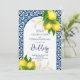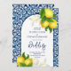 Blue tiles and lemon Amalfi Positano Mediterranean style wedding invitation template with QR RSVP at the back you have to type your url address and code will be generated for you by zazzle.