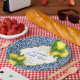 Blue tiles and lemon Amalfi Positano Mediterranean style bridal shower personalised paper plates, Morocco style carved border.