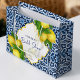 Blue tiles and lemon Amalfi Positano Mediterranean style bridal shower custom gift bag, Morocco style carved border.