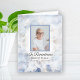 Show appreciation to your guests for remembering your loved-one after their passing at their Celebration of Life Memorial with the elegant Blue Tinted Carnation Floral Sympathy Folded Thank You Note Card. This elegant custom flowery funeral tribute thank you features a digitally watercolor painted floral photograph of white carnation flower blossom petals with a light pale blue tint. Personalise it with the name of the deceased, birth and death day and picture.