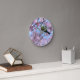 An Eurasian blue tit bird, Cyanistes caeruleus, clinging and hanging down from a branch of a pink flowering cherry blossom tree in spring. A beautiful bird photo taken by Katho Menden, this wall clock is a gift idea for nature lovers.