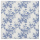 An intricate blue and white toile pattern featuring blooming flowers and winding branches, illustrated in a detailed vintage engraving style.