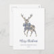 This design incorporates blue French toile and coquette styles, blended with a reindeer graphic. Text: "Merry Christmas", editable for the greeting of your choice and easy to customise with your personal or family name.