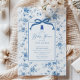 Elevate your baby shower celebration with our exquisite blue and white floral toile invitation, featuring a charming toile de jouy pattern. This elegant piece showcases a coquette bow and a delightful teddy bear. Perfectly crafted to set a sophisticated tone for your event, this invitation not only conveys your joyous occasion but also adds a touch of timeless elegance that your guests will adore. Make your baby shower unforgettable with this stunning invitation that reflects both style and grace.