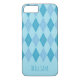 An iPhone 7/8 case designed with an argyle pattern in blue tones. Customise the iPhone case with your name or text among other options.