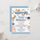 Cute boy's fall themed blue tractor first birthday invitation featuring a cute dark blue tractor, pumpkins, farm animals., balloon, plaid pattern and autumn leaves. This design could be used for any age.