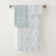 Blue and white trellis patterned bath towel set personalised with your family monogram or other text in a rustic laurel branch. Use the design tools to choose any background colours, edit the text fonts and colours or upload your own photos to create a one of a kind design. The perfect touch for your modern farmhouse bathroom decor!