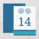 Elegant and classic Nautical Sea Shells Wedding Table Number Postcard with a pair of simple seashells and an array of stripes in dark navy blue and turquoise. This nautical beach themed table card can be easily customised with your wedding details. For more customisation options, click on the Customise It button.