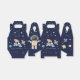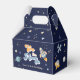 This space birthday favour box features retro 70s text, blue and yellow colours and space illustrations. The illustrations are planets, stars and a rocket ship. The background is space navy blue, making this the perfect way to celebrate your little astronaut.