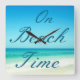This ocean beach wall clock features a photograph of a beautiful blue sea and sky on a clear sunny day with bold typography that spells out On Beach Time.