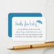 Slip these petite cards into your baby shower invitations when requesting books in lieu of cards. Designed to match our Blue Umbrella shower invitations for baby boys on the way, cards feature a watercolor blue umbrella illustration with "books for baby" at the top and a sweet poem explaining the request: "just one request, we hope it's not hard // Please bring a book instead of a card // By signing your name, we'll remember and share // your sweet gift, even when you're not there." All text is customisable if you'd like to change the wording.