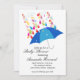Colourful raindrops on a blue umbrella, the perfect theme for boy baby shower invitations the mother-to-be will love.