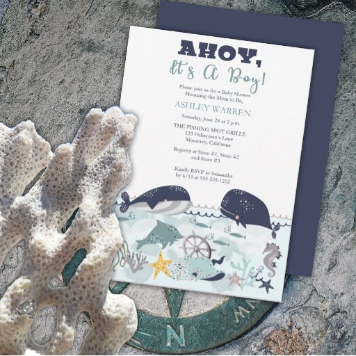 Under the sea themed "Wishes for Baby" baby shower design to pair with our "Ahoy, It's A Boy" sea collection featuring beautiful sea creatures such as whales, a seahorse, a dolphin, an octopus, a stingray, starfish and coral. Main colours are dark blue and medium dusky blue with white. Accented with medium greige, grey, sage green, and golden yellow. A clean look for your shower occasion. Composite design by Hoilday Hearts Designs.