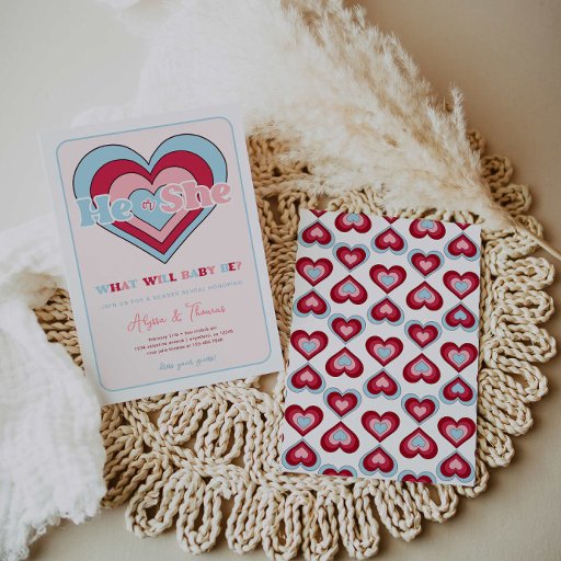 Adorable valentine themed baby shower invitation with red and blue hearts.