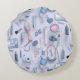 A blue arrangement of items that can be found on a vanity table; like brush, creams, camera, perfume, jewellery, brushes and so on.
