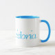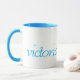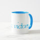 A white mug with pretty blue inside and blue lettering with your name, which is Victoria. Also good for Canadians.