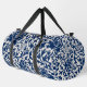 A stylish duffel bag featuring a bold floral pattern in navy blue against a light background.