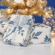 A detailed vintage floral illustration in blue tones, featuring delicately drawn branches, leaves, and blossoms on a light background, creating a classic and elegant botanical look. Toile-de-Jouy