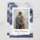 Custom blue vintage photo Christmas cards featuring an elegant script font title, and a photo frame with Christmas gifts and falling snow. Easily personalise these vintage photo Christmas cards with your photo, and family name. Create a magical blue photo Christmas card for your family and friends this holiday season.