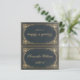 A vintage, elegant blue gold wedding place card with the guest name and the table number printed on its front and the bride and groom names and the wedding date printed on the other side (that is the other half, before folding it), both inside a vintage baroque golden frame. All text is golden calligraphic script, the background is dark blue.