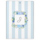 A personalised clipboard with chic feminine style, this design has a light blue and white awning stripe background with a square floral frame surrounding your monogram with beautiful blue and white mixed blossoms. Edit the monogram with your desired initial or other text. This design is repeated on both the front and back of the clipboard.