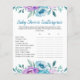 Entertain your baby shower guests with this fun scattergories game styled with beautiful blue and purple watercolor florals.