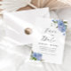 Elegant and rustic save the date card featuring an elegant script that says "save the date" featuring watercolor illustration of blue peony flowers with greenery.