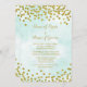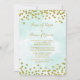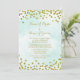 Custom engagement party invitations in light turquoise blue watercolor pattern with gold confetti. Please note gold is photographic effect only.