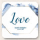 At the centre of the design is the word 'love' written in a modern script font, symbolising the theme of the occasion. Below the script, there's a customisable area where you can personalise the coaster with your names and the date of your wedding or engagement party. This personal touch transforms the coaster from a simple table accessory into a memorable gift for your guests.