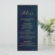 A winter wedding menu, inspired by a snowy night, features a dark blue watercolor background with the wording in gold.
