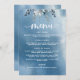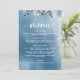 Elegant menu card with decorative blue , sage and grey foliage on the top. Dusty Blue watercolor wash as background. Menu in hand written Script typography. Back in blue watercolor wash and exquisite bouquet in the centre for your name(s) and event or date. part of our "Blue Rustic Mountains" wedding and events collection.
