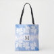 Modern blue watercolor wash, maple leaves and monogram tote bag. It features borders of white maple leaves on blue watercolor wash and your monogram in a frame with outline placed in the centre.