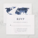 This chic, modern wedding response card features a white, watercolor paper look background with blue text. The back of the RSVP card features a blue watercolor look world map. Perfect for the wedding of any couple who loves to travel, or anyone having a destination wedding.