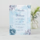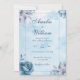 This elegant and floral wedding invitation features blue watercolour roses and leaves on a blue watercolour background are perfect for a floral themed wedding.