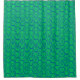 This shower curtain has an art deco design of blue curved lines in a triangle shape on a field of green repeated across the design. Want a different colour? Message me.