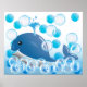 Sweet and happy blue whale surrounded by soap bubbles to brighten up the nursery or perhaps where baby gets a bath.
