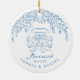 Personalized first Christmas married ornaments feature whimsical hand drawn doodle floral and wedding car in blue and white, modern and elegant.
