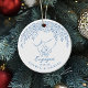 Personalized first Christmas engaged ornaments feature whimsical hand draw doodle floral, holding hands with wedding ring in blue and white, modern and elegant.
