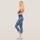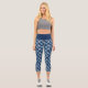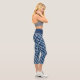 On this pair of capri leggings, a series of blue and white freehand paint stripes are placed in a alternating pattern on a darker royal blue background. A modern pattern that will become timeless.
