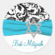 This 1.5" round aqua blue, white, and black damask Bat Mitzvah sticker and/or envelope seal has a FAUX ribbon and silver Star of David brooch on it. It matches the Bat Mitzvah invitation shown below. You can change the text to say whatever you want, and you can also change the sticker size and/or shape. If you require any other matching items in this design, please email your request to niteowlstudio@gmail.com.