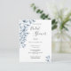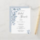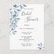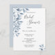A trendy bridal shower invitation in white and dusty blue. A chic white background on the front. Decorated with botanical blue coloured sprigs and foliage. Modern large handlettered script, typography with the text: Bridal Shower. Templates for the bride to be's name and party details. Dark grey text.