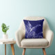 Modern throw pillow features a stylised botanical line drawing of a mini coconut palm; designed in a trendy complimentary colour palette of blue with shades of navy and sapphire blue with complimentary white accents