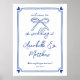 Hand Drawn Blue White Bow European Inspired Wedding Welcome Sign. Welcome your guests with this elegant wedding welcome poster sign, designed in a classic blue and white palette reminiscent of French, Italian, and European styles. The sign features "Welcome to the Wedding of..." at the top, with the bride and groom's names showcased in the centre, followed by "We are so glad you are here!" for a warm and inviting touch. The wedding date is elegantly displayed at the bottom.