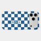 Cool iPhone case features a bold blue and white checkered pattern with a customizable monogram. Add (or delete) 3 initials or numbers in the sidebar to personalize it. The geometric checkerboard pattern is made of rows of alternating white and blue squares. Other case styles and models also available in the sidebar.