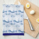 A kitchen towel with vintage blue and white Delft art of a sailboat sailing on the water in the harbour, surrounded by floral elements, reproduced from an antique tile, with blue borders.