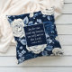 Beautiful dusty blue and white roses on navy blue pillow, with the Bible verse, Joshua 24:15 on one side: "As for me and my house, we will serve the Lord." Text is fully customisable, so add your own favourite verse or text.
